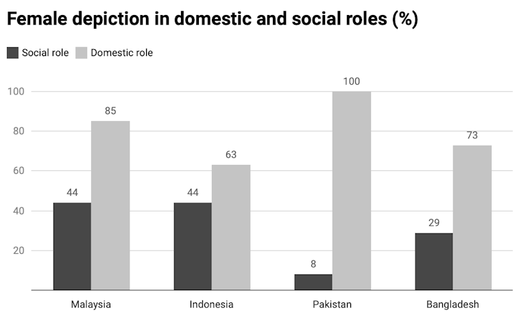 Bahkan di buku Indonesia dan Malaysia, yang memiliki proporsi yang lebih seimbang antara laki-laki dan perempuan, kami menemukan bahwa peran domestik ini didominasi oleh perempuan dengan angka masing-masing 63% dan 85%.